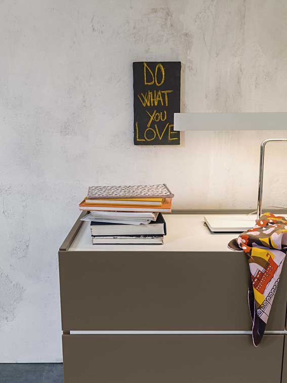 Diese Kommode ist in bicolor-Ausführung erhältlich, Lackierung Lack Matt Plus Grigio Tortora M13 und Bianco Gesso M01.