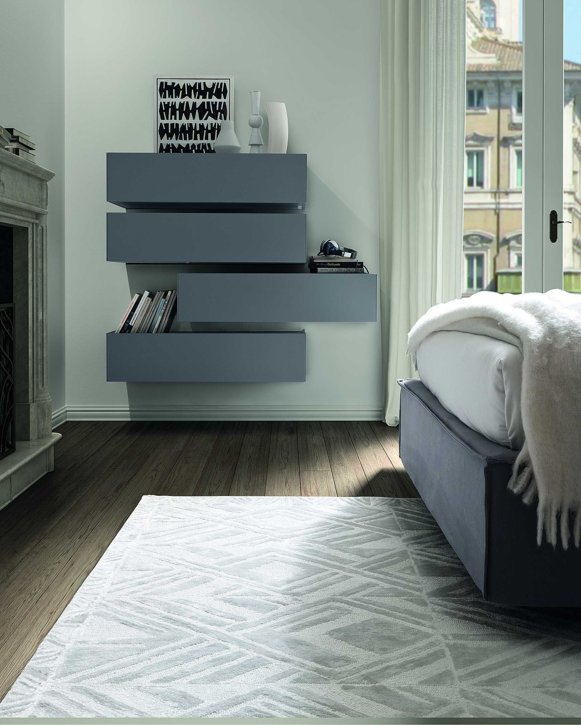 Die Wohnkomposition besteht aus 4 einzelnen Schubladenelementen, welche an der Wand befestigt werden können. Diese können in verschiedenen Positionen - je nach Kreativität - unterschiedlich positioniert werden.